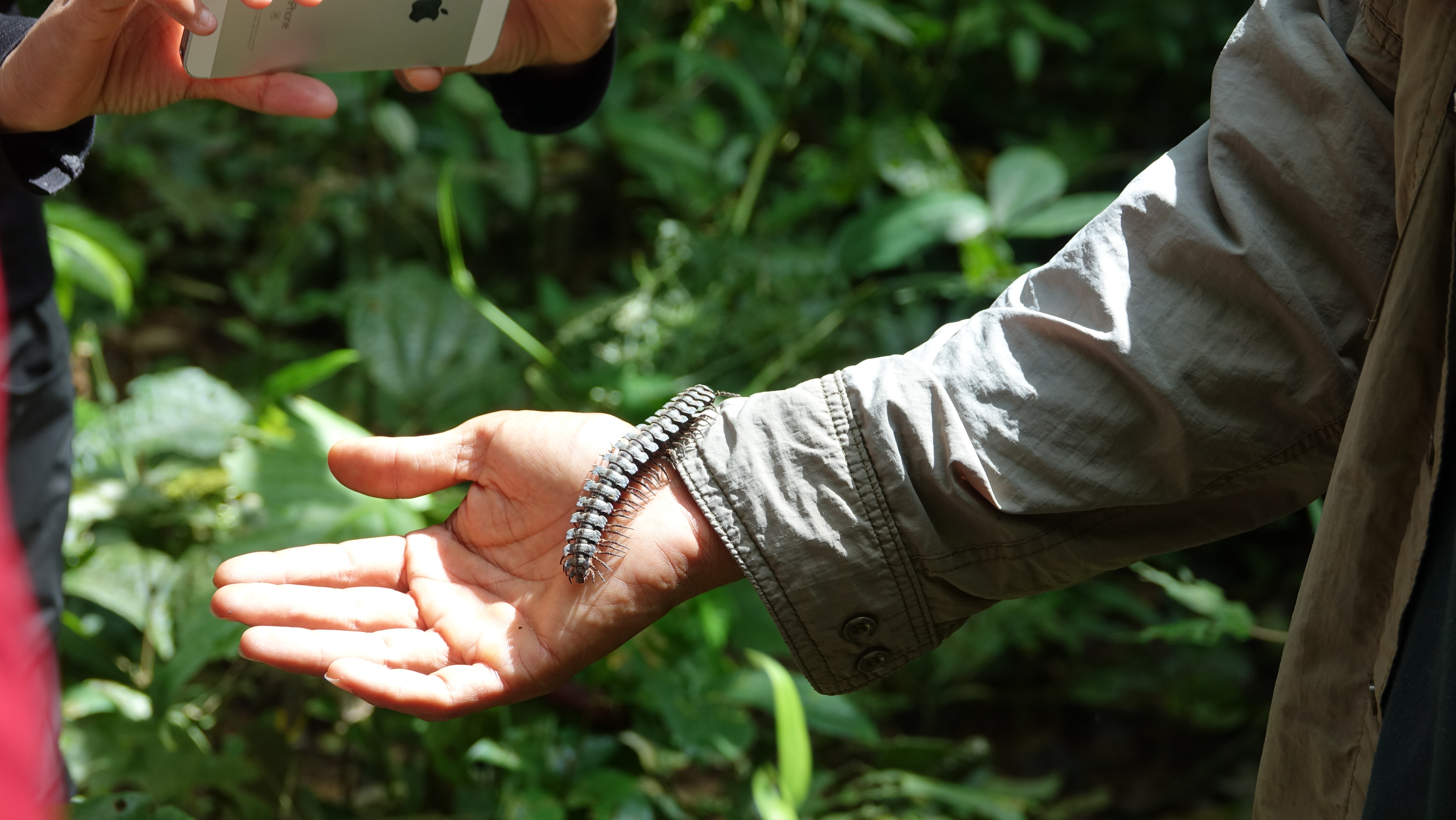 A 20h : sortie nocturne, des bottes nous sont prêtées nous nous équipons et partons à la rencontre d’insectes, de grenouilles, un bébé tarentule, une tarentule adulte et un gros gros crapaud.